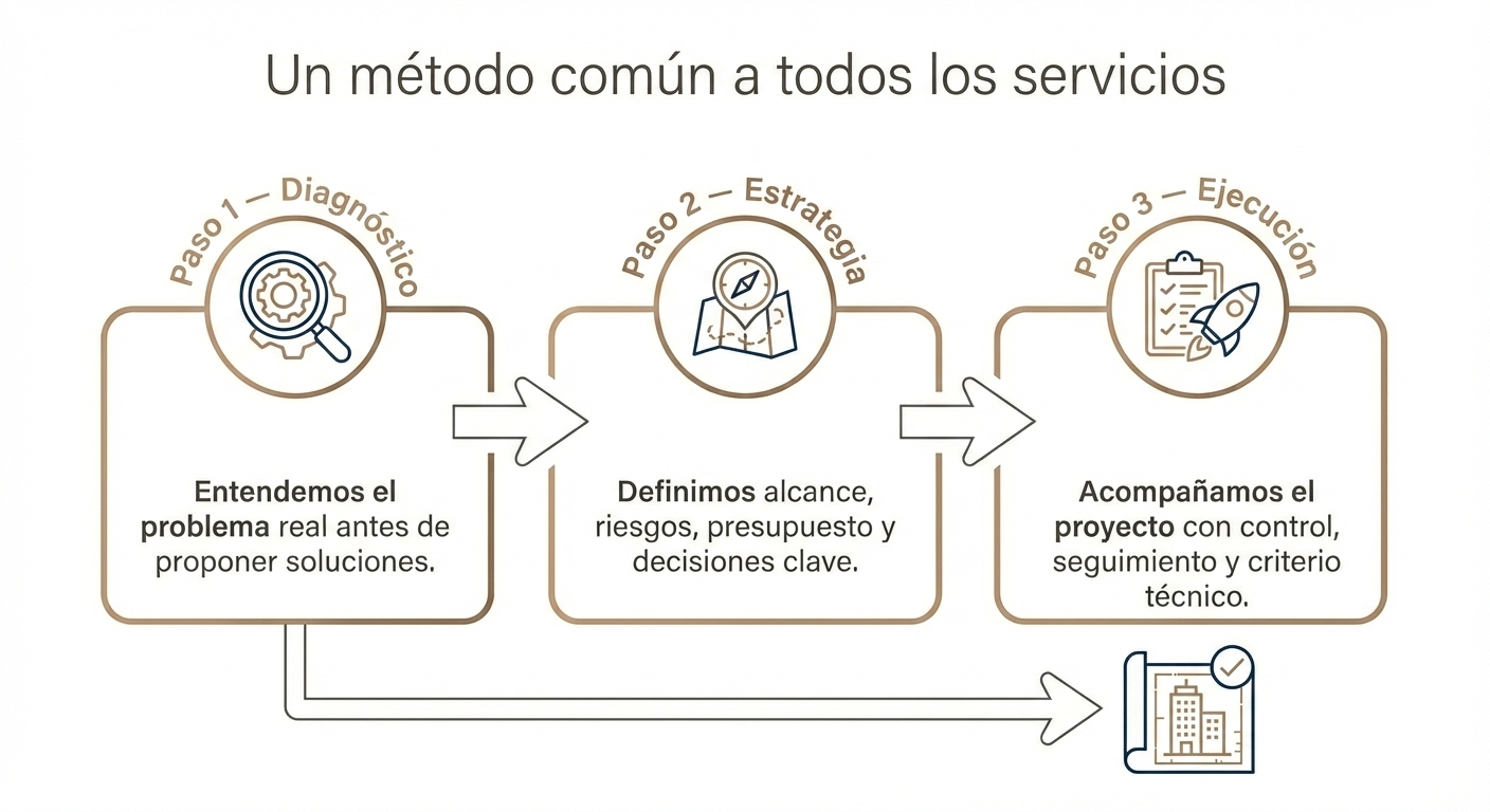 Intervenimos proyectos que requieren dirección, toma de decisiones informadas y control técnico. Actuamos como arquitectos, consultores y gerentes del proceso.